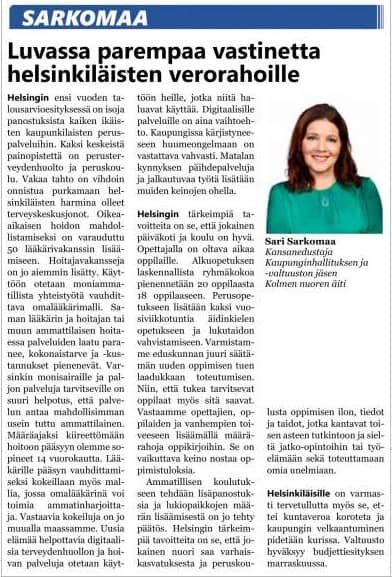 Helsinkiläisille on varmasti tervetullutta myös se, ettei kuntaveroa koroteta ja kaupungin velkaantuminen pidetään kurissa. Valtuusto hyväksyy budjettiesityksen marraskuussa.