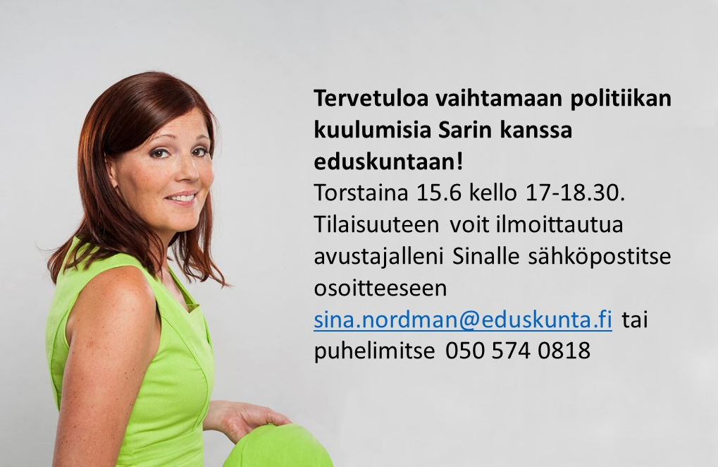 Tervetuloa kuulemaan ja keskustelemaan Suomen ja Helsingin politiikan ajankohtaisista aiheista to 15.6 kello 17-18.30. Tilaisuuteen voit ilmoittautua avustajalleni Sinalle sähköpostitse osoitteeseen sina.nordman@eduskunta.fi tai puhelimitse 050 574 0818. Sisääntulo eduskuntaan on Arkadiankadulta osoitteessa Arkadiankatu 3. Tulethan turvatarkastuksen takia ajoissa paikalle. Avustajani saattaa tilaisuuteen osallistujat turvatarkastuksen jälkeisestä aulasta kokoustilaan.