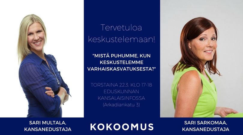 Tervetuloa kuulemaan ja keskustelemaan varhaiskasvatuksen uudistamisesta torstaina 22.3 klo 17- 18.30 Pikkuparlamentin Kansalaisinfoon (Arkadiankatu 3).